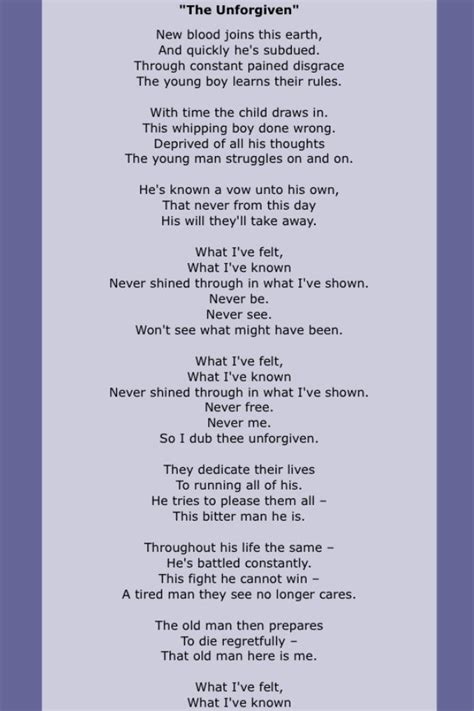 The unforgiven is a power ballad by american heavy metal band metallica. Never shined through in what i've shown. What i've felt, what i've known. That the world has battered you so bad that you are, inside, an old man. The young boy learns their rules deprived of all his thoughts they dedicate their lives to running all of his.