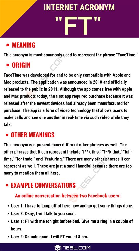 When people want someone to facetime them, they can just use the acronym ft. It makes life easier and is more convenient. Ft is an acronym for “facetime”. Fametracker (website) showing only slang/internet slang definitions ( show all 92 definitions) note: